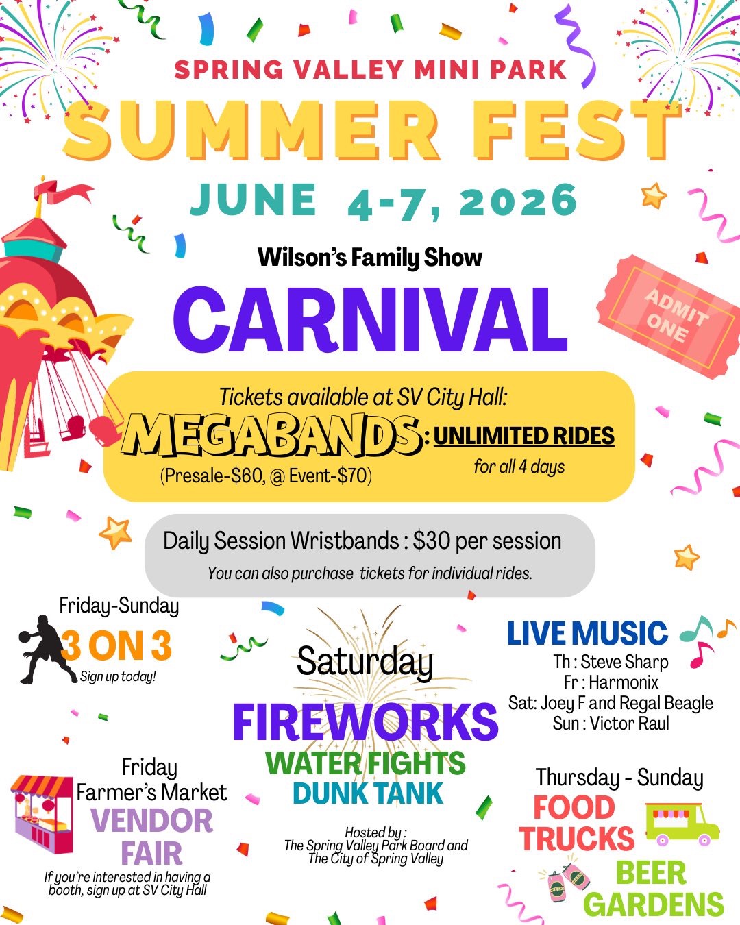June 4 -7 – Spring Valley – Summerfest in Spring Valley Mini Park – Thurs & Friday–Wristband ride specials with Wilson’s Carnival 6-10 pm, Sat. 1-10 pm, Sun 1 -5 pm. Beer Garden 6-10 pm Thurs, 6-11 pm Fri & Sat. Sunday 1 – 5pm. Food trucks daily. Thursday -Live music by Steve Sharp 6-9 pm; Friday – Harmonix 7-10 pm, Farmers Market Vendor Fair, Friday Night Lights – Adult 3 on 3. Saturday – Fire Dept Fire Fights,Live music by Joey F 4-7 pm, Regal Beagle 8-11 pm, Fireworks at Dusk on 6-6; Sunday- Victor Raul 1-4 pm.